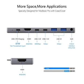 Equipped with an 87W Power Delivery (PD) USB-C port, you can charge your devices quickly while using them. The hub includes two USB-C data ports and two USB 3.0 ports, allowing multiple devices to connect simultaneously, making data transfers faster and more convenient. Additionally, a 3.5mm audio jack is provided for effortless listening on your favorite headphones or speakers. Crafted with a sleek design, the GIKERSY hub complements your MacBook while providing robust functionality.