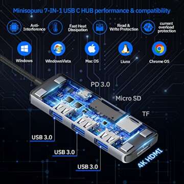 Show more Discover the ultimate solution to your connectivity needs with the USB C Multiport Adapter from Minisopuru, designed to seamlessly integrate with your Type-C devices. This plug-and-play adapter requires no drivers, making setup a breeze. With the ability to extend a single USB-C port to seven multifunctional ports, it fulfills all your everyday requirements. Experience lightning-fast data transfer speeds of 5Gbps through the three included USB 3.0 ports, ensuring that syncing and file sharing are swift and efficient.