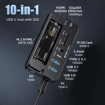 When compared to other USB-C docking stations on the market, the ACASIS USB C Docking Station stands out for its extensive range of ports and high-speed capabilities. Where others may offer limited ports, this docking station provides a comprehensive suite of 10 connections designed to address every modern user's needs. Its unique SSD enclosure feature is another significant advantage, allowing for enhanced storage flexibility, which many competitors lack. Coupled with an impressive aesthetic and robust performance, it easily elevates itself above standard offerings.