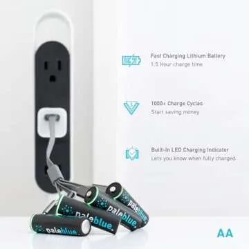 USB Rechargeable Smart Batteries by Pale Blue, Lithium Ion, Under 90 Minute Charge Time, Over 1000 Cycles, 4-in-1 USB to USB-C Charging Cable, LED Charge Indicator (8 AA and 8 AAA Batteries)