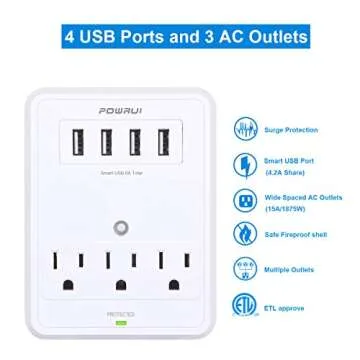 USB Wall Charger, Surge Protector, POWRUI 3 Outlet Wall Mount Adapter with 4 USB Ports Charging Station (30W) Compatible iPhone Xs/XS Max/XR/X/8/7/6/Plus, Pro/Air 2/Mini 3/Mini 4, Samsung S4/S5, 6A