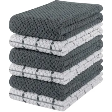 Show moreWelcome to the ultimate kitchen essential – our premium set of six cotton dish towels, featuring three elegant grey and three crisp white dobby weave style towels. Each towel measures a generous 15 x 25 inches, perfectly designed for all your cooking and cleaning needs. Crafted by Utopia Kitchen, a brand synonymous with quality and style, these towels blend functionality with a touch of luxury. Made from 100% ring spun cotton, they provide a lush feel while maintaining robustness for everyday use. You'll enjoy their soft texture, which is gentle on your skin while delivering impressive absorbency and durability, making them ideal for drying dishes or wiping down surfaces.