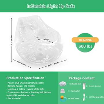Show more This LED inflatable chair is the perfect blend of style and utility, making it a must-have addition for any modern home. Crafted from environmentally friendly PVC, the chair boasts an IP54 waterproof rating, making it suitable for both indoor and outdoor use. Whether you're lounging at home or enjoying a cozy night under the stars, this chair ensures comfort and versatility.
