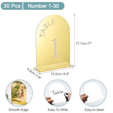 Show moreIntroducing the uxcell 30pcs 4.8 x 7 Inch Gold Arch Acrylic Sign with Stand, a stunning centerpiece for any event! These sleek and modern table number holders are expertly designed to enhance the elegance of your wedding, engagement party, or other celebrations. Measuring 4.8 x 7 inches, with a sturdy 1/8 inch thick acrylic material and bases measuring 1.8 x 4.9 inches, these table signs provide not only durability but also sophistication. The clear acrylic bases are crafted for maximum support, ensuring your table number stands firmly throughout your event.