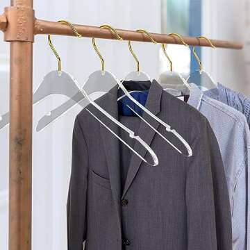Show moreTransform your closet into a stunning showcase with the uyoyous Acrylic Clear Hangers 20 Pack. Crafted from high-quality, crystal-clear acrylic, these hangers not only provide a sleek and luxurious look but also ensure durability that stands the test of time. Each hanger comes with an elegant streamlined design, featuring a golden 360-degree swivel hook that allows for easy access to your garments. With dimensions of 15 L x 390mm x 9.5in and a thickness of 0.4 inches, these hangers are lightweight at just 0.32 lb each yet possess exceptional load-bearing capabilities, making them perfect for everything from delicate blouses to heavy coats.