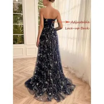 Show moreStep into the spotlight and command attention with the UZN Navy Blue Sparkle Starry Tulle Prom Dress. This exquisite gown is designed for those special occasions when you want to embody elegance and glamour. The dress features delicate tulle detailing, a stunning strapless design, and a striking v-neckline, offering the perfect blend of sophistication and sex appeal. Embellished with shimmering sequin glittering stars, this dress captures the magic of the night, ensuring you shine wherever you go. The captivating starry fabric flows gracefully around your body, complemented by a flattering leg slit and a floor-sweeping length that enhances your silhouette beautifully. Plus, the functional side pockets add a practical touch without compromising style, making this gown not just beautiful but also convenient.