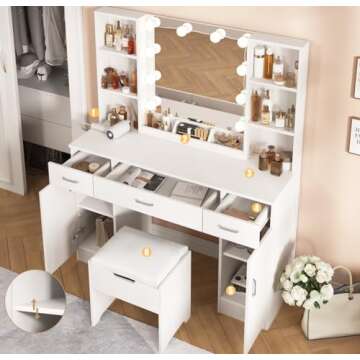 Vabches Makeup Vanity Desk with Lights, 3 Lighting Colors, White Vanity Set Makeup Table, Large Vanity with 3 Drawers, 2 Cabinets and Multiple Shelves, 45.2in