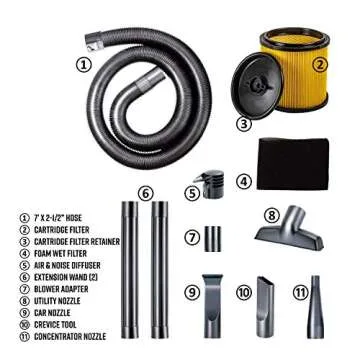 Equipped with a 12-foot power cord, this vacuum offers enhanced mobility, making it perfect for extensive cleaning tasks, from hardwood floors to tough automotive jobs. Included accessories like the 7' x 2-1/2” secure fit hose, multiple extension wands, and specialized nozzles cater to all your cleaning needs, whether it’s suctioning up dust from the corners of your home or dealing with wet spills in your garage.