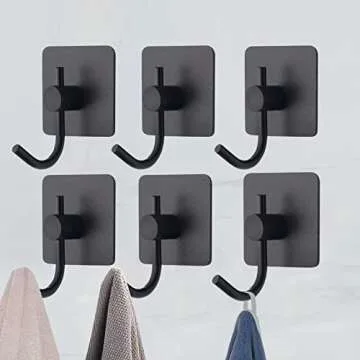 VAEHOLD 6 Pack Adhesive Wall Hooks, Heavy Duty Sticky Holder Aluminum Towel Hooks for Hanging Coat, Hat, Key, Clothes, Closet Hook Wall Mount for Kitchen, Bathroom, Office (Black)