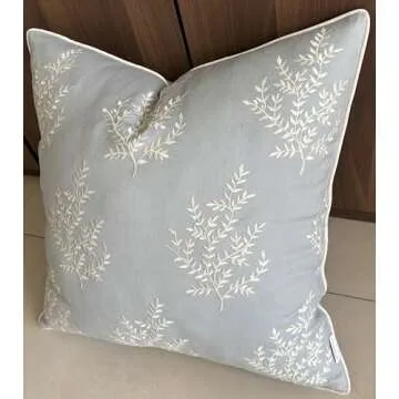 VAGMINE Hand Crafted Embroidered Cotton Square Decorative Accent Throw Pillow Cover - for Master Bedroom, New Home, Anniversary, Farmhouse, Couch, Sofa - Leaves-Robins Egg, 18x18 Inches