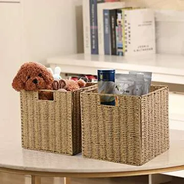 Vagusicc Wicker Storage Basket, Set of 2 Hand-Woven Wicker Basket, 11 inch Storage Baskets for Organizing and Decor, Foldable Cube Storage Organizer Bins Baskets for Shelves, Woven Basket, Natural