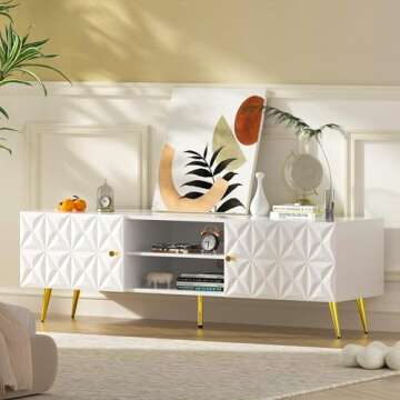 The all-white finish combined with elegant gold accents not only adds a touch of glamour but also makes it a perfect fit for various interior styles, from modern to mid-century chic. The sturdy construction, made from certified quality MDF, ensures durability and stability, supporting TVs up to 65 inches effortlessly. Plus, the addition of 4 solid legs and an adjustable support leg guarantees a strong base that reassures your family’s safety with its anti-tip devices.
