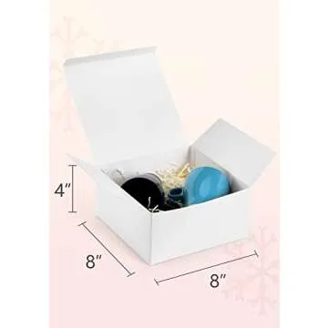 Show more Introducing the ValBox 8x8x4 Inches Gift Boxes - a versatile and elegant solution for all your gifting needs! With a pristine white finish and glossy exterior, these heavy-duty recyclable cardboard boxes are perfect for presenting various gifts, from glasses and mugs to jewelry and special surprises for bridal parties, birthdays, or festive events. Each set includes 12 carefully crafted boxes and 2 bundles of twine totaling 66 feet, making it easy to personalize your presents. Designed for convenience, these boxes will make your gift-giving experience both stylish and eco-friendly.