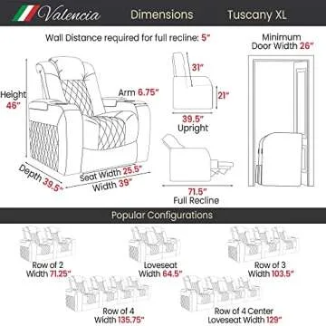 Show more Experience the ultimate in comfort and style with the Valencia Tuscany XL Theater Seat. Crafted from premium Italian Top Grain Nappa leather, this luxurious recliner is designed to provide unrivaled relaxation while enhancing the aesthetic of any living space. Each seat features a stunning diamond stitch detail, elevating your home theater or lounge area. Whether you're watching a blockbuster movie or enjoying your favorite show, this chair promises to deliver a royal experience.