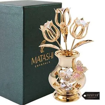 Valentine's Day Gift for Women, Girlfriend - Matashi Crystal Flowers Bouquet, 24K Gold Plated Figurines Table Centerpiece Gift for Her, Mom, Daughter, Grandma, Aunt - Decorative Butterfly Studded Gift