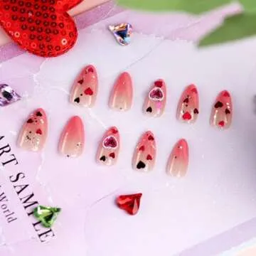 Show more Transform your nails this Valentine's Day with our Valentine's Day Press on Nails Pink Heart Gem Sequin Fake Nails. Each set brings together the magic of love and creativity, featuring 24 enchanting pieces that range in size from small to extra-large, perfect for every unique nail. Designed for easy self-application, this kit ensures you’ll achieve that stunning salon-quality look right at home. With adorable heart designs and sparkling sequins, these long almond-shaped press-on nails will make your fingertips the center of attention, whether it’s for a romantic dinner or a festive party.