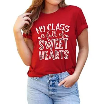 Valentine Teacher T-Shirts Women My Class is Full of Sweethearts Shirt Casual Loose Short Sleeve Tees Tops (Red, Medium)