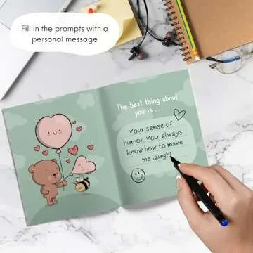 Show moreCelebrate love in its most delightful form with Aly Lou's Personalized Memory Book. This enchanting hardcover book comes elegantly packaged, ideal for a heartwarming gift that transcends the ordinary. It features 60 beautifully illustrated pages alongside 29 fill-in-the-blanks prompts designed to help you articulate the depth of your feelings. Compactly sized at just 5.5” x 4.25”, it fits perfectly in your hands, making the writing process an intimate experience.