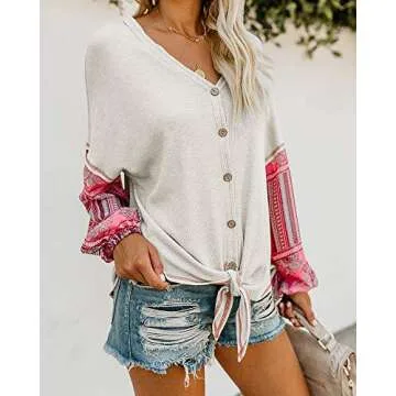 Experience the perfect blend of style and comfort with the Valphsio Women's Boho Long Sleeve Henley Shirt. This chic blouse features a delightful V-neck design, a front tie detail, and a button-down structure that embodies the essence of relaxed elegance. Known for its bohemian vibe, this shirt perfectly complements your spring wardrobe, making it an ideal choice for both casual outings and slightly dressier events. The innovative patchwork style not only adds a unique touch but also allows...