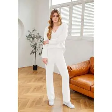 Show moreStep into effortless style and comfort with our VamJump Women’s White 2 Piece Outfits, which includes a chic v-neck long sleeve sweater pullover and trendy wide leg pants. Designed to cater to a variety of occasions, this lounge set combines fashion with functionality, providing a versatile look that can be effortlessly dressed up or down. Made from a super-soft knit fabric, this set guarantees a cozy fit that you'll want to live in. Its drop shoulder design and long lantern sleeves not only add a touch of elegance but are also perfect for a relaxed, casual vibe.