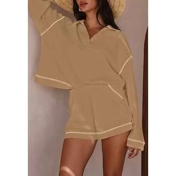 Show moreIntroducing the VamJump Women Waffle Knit Lounge Sets – your new favorite ensemble for ultimate comfort and stylish living. Crafted with high-quality, skin-friendly waffle knit fabric, this fashionable V-neck lapel top paired with high-waisted shorts offers the perfect blend of coziness and chic design. The long batwing sleeves with a trendy drop shoulder create a relaxed silhouette that's equally laid-back and elegant, making it a versatile addition to your wardrobe.