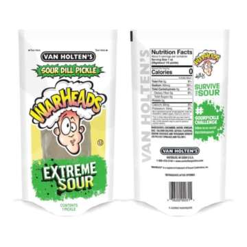 Indulge in the tangy delight of Warheads Sour Dill Pickle in a Bag - a truly unique treat that transforms the traditional pickle experience into a fun and flavorful adventure. Each pack is specially curated to bring you the perfect balance of sour and pickled goodness, making it a must-try for all sour snack enthusiasts. Gluten Free, Fat Free, Low Carb, and Certified Kosher, these pickles cater to various dietary preferences, ensuring that everyone can enjoy this zesty snack without guilt....