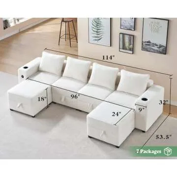 VanAcc 114 Inch Sectional Sofa with Storage & USB Ports, Beige Couch, 6-Piece Set