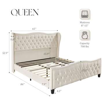 VanAcc Queen Size Platform Bed Frame, Wavy Velvet Wingback Upholstered Bed with Handmade Deep Button Tufted 52.9" Tall Headboard & Footboard/No Box Spring Needed/Cream