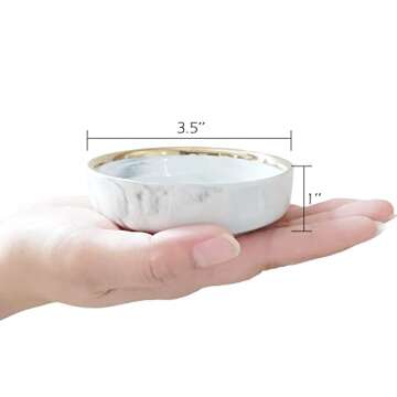 Show moreIntroducing the VanEnjoy 3.5 inches Marble Porcelain Side Dish Bowl, an exquisite addition to your dining experience. Crafted from high-quality marble glaze ceramic, this stylish set of four bowls showcases a stunning marble pattern elegantly trimmed with a chic gold rim. Each bowl not only boasts impeccable design but also functional versatility, serving as the ideal canvas for your favorite sauces, sushi, or condiments. The non-toxic, BPA-free material ensures that your meals are enjoyed with both freshness and healthiness, making mealtime a delightful ritual every day.
