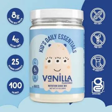 Show more Introducing our delicious and nutritious kid's nutritional shake, crafted with love in the USA in a Good Manufacturing Practices (GMP) facility. This shake is not just an ordinary drink; it’s a healthy blend designed specifically for children to kickstart their day or serve as a wholesome snack in between meals. Each serving packs a powerful punch with 8g of Organic Protein from high-quality organic milk, along with a delightful blend of 6 Organic Vegetables and 25 essential Vitamins and Minerals, all contained within just 100 calories.