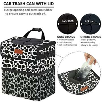 Show moreIntroducing the Vankor Car Trash Can – the ultimate solution to keep your vehicle neat and organized! This exquisite car garbage can is designed with a charming cow print, adding a touch of style while tackling the clutter in your car. Engineered for practicality, it features a large capacity of 2.2 to 3.0 gallons, making it perfect for car rides of any length. Whether you're commuting to work or embarking on a road trip, this adorable yet functional trash bin will ensure your car remains clutter-free, boosting your mood as you drive.