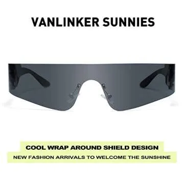 Show more Step into the spotlight with the VANLINKER Futuristic Trendy Wrap Around Sunglasses, a must-have accessory that effortlessly combines fashion and functionality. These avant-garde shades are designed for both men and women who love to make a statement in their personal style. With a sleek rimless cyberpunk visor design, these sunglasses embody the Y2K aesthetic, making them the perfect choice for anyone looking to add a modern twist to their outfits. Despite their stylish appearance, they also prioritize comfort and practicality, wrapping around your face securely to protect against harmful UV rays.