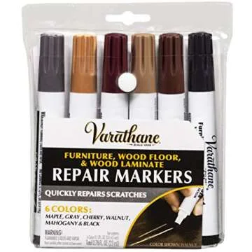 The Varathane Wood Stain Repair Marker Kit includes a variety of colors including Maple, Gray, Cherry, Walnut, Mahogany, and Black.