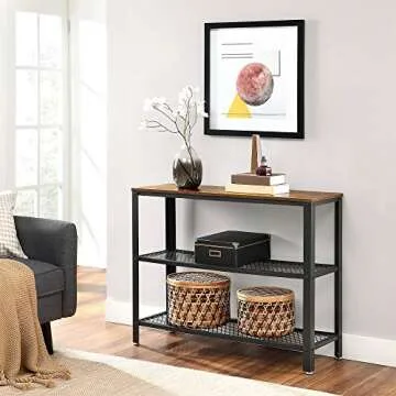 Show more Transform your living space with this exquisite console table that effortlessly combines style and functionality. This charming 40-inch console table, crafted from sturdy black steel and particleboard in a rustic design, serves as the perfect addition to any home. Its sleek silhouette and mixed material construction allow it to both stand out and blend seamlessly with your decor. Display cherished photos, small decorative pieces, or a vibrant bouquet of flowers on its surface to create an inviting atmosphere that reflects your personality. All it takes is a little creativity and this versatile table to elevate your home's appeal.