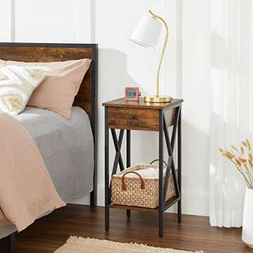 Show moreThe VASAGLE Tall Nightstand with Drawer and Storage Shelf is the perfect blend of modern elegance and rustic charm. Crafted by VINCYER, this end table showcases a beautiful combination of warm rustic brown and sleek matte black, embodying an industrial ambiance that enhances any bedroom décor. Designed not only to be stylish but also practical, it features a robust steel X frame paired with durable particleboard, ensuring both stability and sophistication. With a height of 27.6 inches, its optimal design allows it to fit comfortably beside your bed, providing the right amount of storage without overpowering your space.