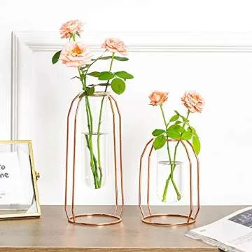 Show more Transform your living space with the elegance of our Vases Set of 2 Glass Vases with Metal Frame. Designed with a sophisticated rose gold metal frame, these modern terrarium planters are not just vases; they are decorative pieces that elevate any room. With one large vase measuring 9.25 inches and a smaller one at 6.3 inches, they perfectly accommodate your floral arrangements. Whether adorning your dining table or accentuating your kitchen counter, these vases create an enchanting atmosphere that combines minimalism with beauty.