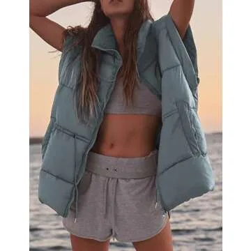VATEAMI Women's Quilted Puffer Vest Lightweight Zip Up Stand Collar Adjustale Waist Sleeveless Padded Gilet Coat with Pockets (Dustyblue-S)