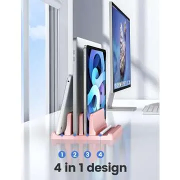 Show more Introducing the Vaydeer Vertical Laptop Stand for Desk – an elegant solution to elevate your workspace efficiency and organization! This innovative dual-slot design allows you to hold two laptops simultaneously, maximizing your desk space while enhancing productivity. Crafted from durable ABS plastics, this stand is not only lightweight but also remarkably sturdy, ensuring your devices remain securely in place while you work. The chic pink finish paired with exquisite workmanship featuring a glossy surface adds a touch of style to any modern office or home environment.