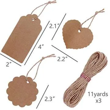 Show moreIntroducing the perfect companion for all your gifting and crafting needs: our versatile Gift Tags and Jute Twine Set. This all-in-one set includes 50 round tags, 50 heart tags, 50 rectangular tags, and 33 yards of natural jute twine. Crafted with care, each tag is made from durable kraft paper, ensuring they can withstand the rigors of wrapping and decorating, while the jute twine adds a rustic, organic touch to your creations. Whether you're looking to embellish a simple gift or elevate a special occasion, this comprehensive package delivers a fantastic array of options for personalization. Perfect for various occasions and crafts, these tags allow you to express your creativity and sentiment with ease.
