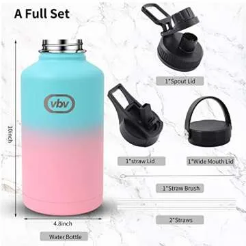 vbv Insulated Water Bottle - 64 Oz, 3 Lids (Straw Lid), Half Gallon Large Metal Stainless Steel Water Jug, Big Double Wall Vacuum Flask, Leakproof Keep Cold & Hot for Sports and Travel