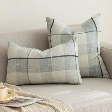 vctops Rustic Lattice Cotton Linen Decorative Throw Pillow Cover Embroidery Square Cushion Cover Pillowcase for Sofa Bedroom Couch (Grey White Plaid, 18"x18")