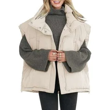 Veatzaer Womens Oversized Puffer Vest Outerwear Stand Collar Drawstring Hem Sleeveless Jackets Zip Warm Winter Coats