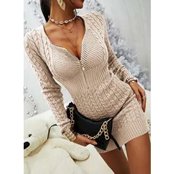 Veatzaer Womens Zipper V-Neck Casual Slim Fit Sweater Dress Long Sleeve Solid Sweaters Knit Mini Dress Apricot