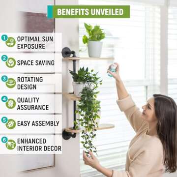 Show more Introducing our innovative window plant shelves, designed to transform your gardening experience! This unique plant shelf features a rotating mechanism that allows you to easily adjust the angle of each shelf, ensuring your beloved plants receive optimal sunlight throughout the day. Say goodbye to dull and unhealthy foliage, as our window plant hanger promotes robust growth, resulting in vibrant, healthier plants.