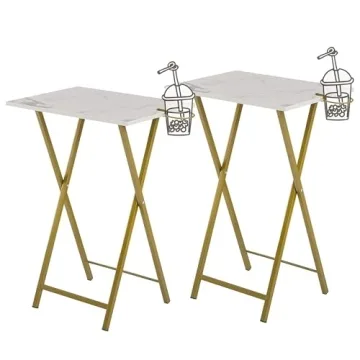 Show more Introducing the VECELO Folding TV Tray for Eating Set of 2 - the perfect blend of modern style and practicality, designed for those who appreciate adorned living spaces without compromising functionality. Crafted with an X-shaped steel frame and topped with elegant white particleboard, these trays not only serve their purpose but add a touch of sophistication to your home. The stunning golden color enhances their aesthetic appeal, making them a chic choice that complements various home decors, from contemporary to rustic.