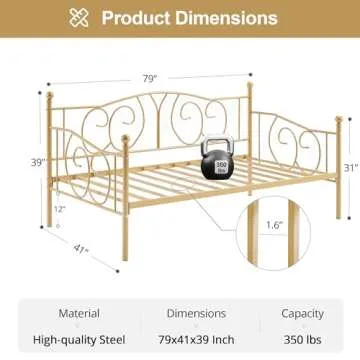 Show moreIntroducing the VECELO Metal Daybed Frame, a stunning multifunctional platform bed that seamlessly combines elegance with practicality. Crafted with robust heavy-duty metal, this twin bed frame is designed to last, ensuring durability and stability for years to come. With its lovely gold finish, it complements a wide variety of home decor styles, making it an exquisite addition to your bedroom, kids' room, guest room, or even your living room. The thoughtfully designed structure not only enhances the aesthetic appeal but also maximizes functionality, offering ample underneath storage space and a strong mattress foundation all in one.