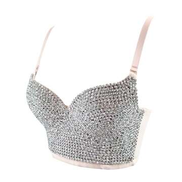 VEENDEO Women's Bustier Crop Top Mesh Corset Top Push up Rhinestone Diamond Bra Club Party Vest (#2 Silver&Beige, XS)