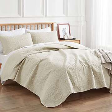 Show more Introducing the VEEYOO Ivory Quilts Queen Size - Ultrasonic Embossing Lightweight Bedspread Quilt Set, a luxurious and practical addition to your bedroom decor. This exquisite 3-piece bedspread set includes two cozy pillow shams (20x26") and a generously sized bedspread (92x100") designed to fit queen-sized beds perfectly. Its slightly oversized dimensions ensure an elegant drape, providing equal coverage on both sides of the bed for a sophisticated look. Ideal for protecting your comforter from pet hair, this stylish coverlet not only enhances your bedding but also elevates the aesthetic appeal of your space.