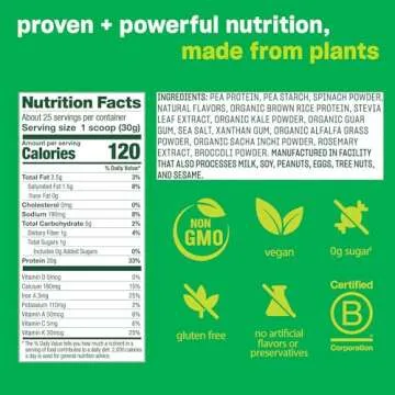 The primary ingredients include pea protein, organic spinach, kale, alfalfa, and broccoli.
