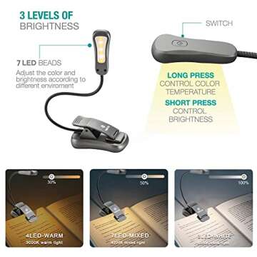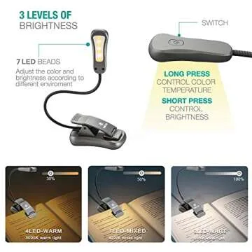 Show moreIlluminate Your Night with the Vekkia Rechargeable Book Light, designed to provide unparalleled reading comfort whether you’re diving into your favorite novel or studying late into the night. This innovative book light features advanced SMD LED technology, delivering a lighting area that is three times larger compared to ordinary LED lights. No more squinting or struggling with inadequate illumination; with multiple light settings, you can effortlessly customize your reading experience. Just long press the button to change the color temperature and quick click to adjust the brightness, making it the perfect companion for nighttime reading, studying, or even knitting.